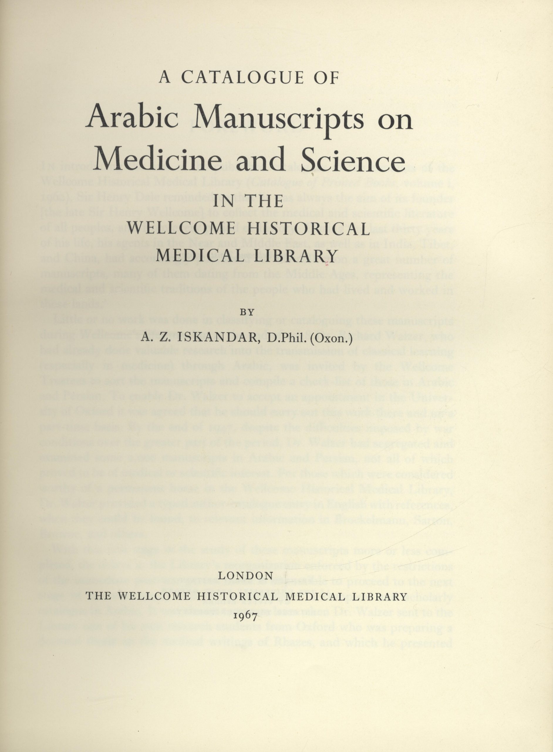 A catalogue of full descriptions of all the Arabic manuscripts in the Wellcome Historical Medical Library, including items of medical or scientific interest which have never been studied before. The History of Medicine of the Wellcome Library Collection reflects a broad understanding of the history of medicine and medical thought and practice from the earliest times, and in different societies and cultures around the world. It is primarily a print collection and contains materials published from 1850 to the present day.
