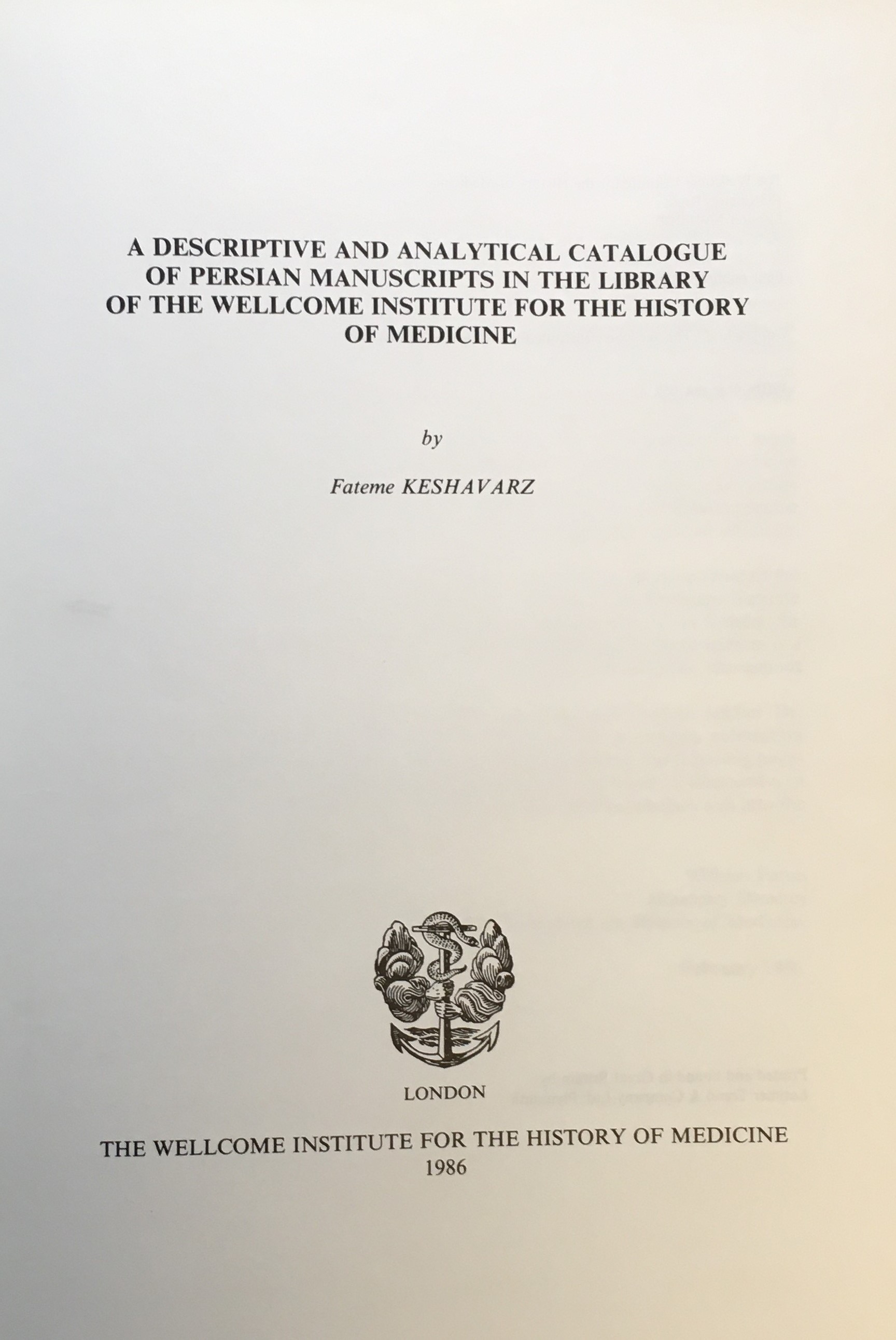 A Descriptive and Analytical Catalogue of Persian Manuscripts in the Library of the Wellcome Institute for the History of Medicine.