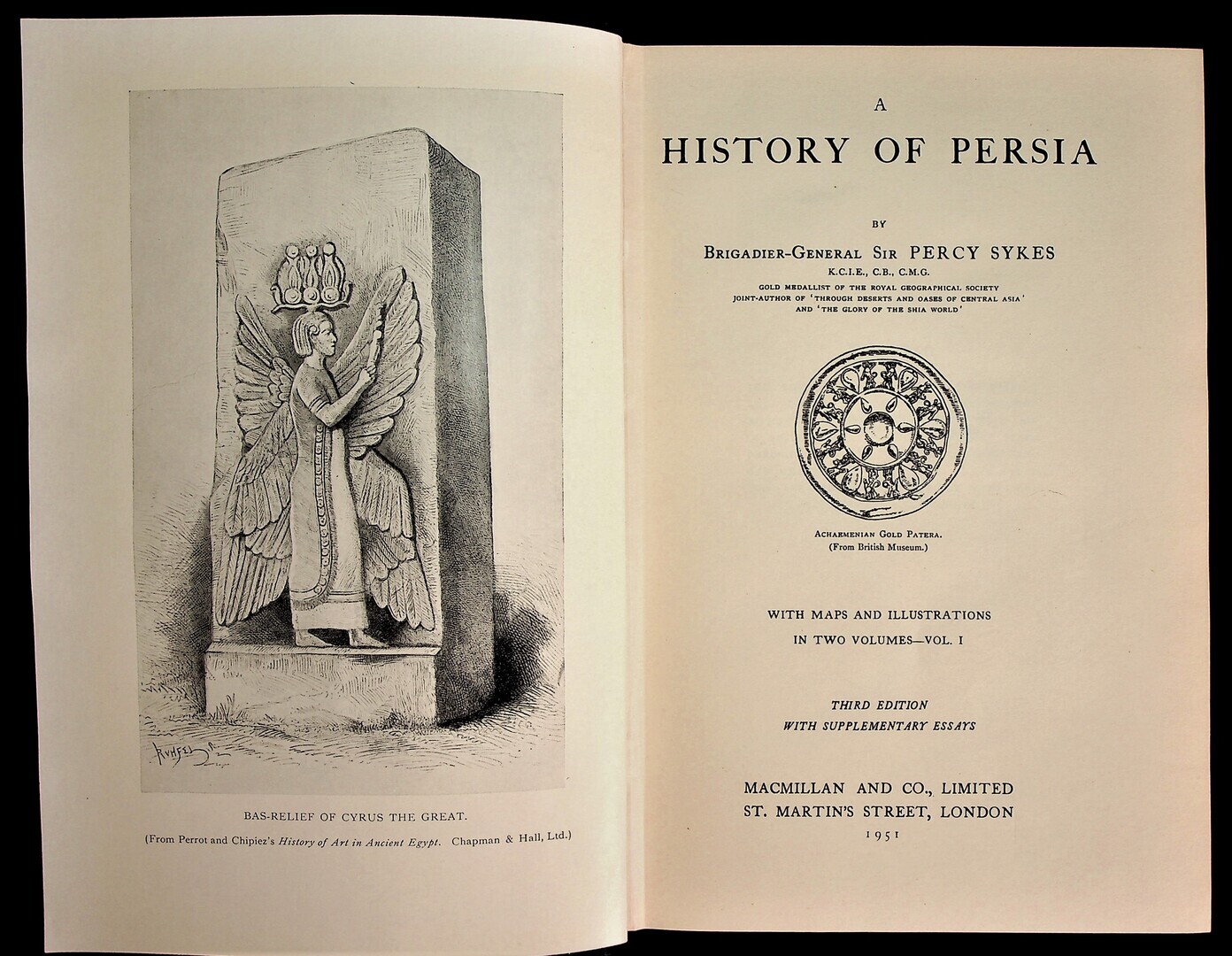 The superb and scarce (as scarce as the 1915 first edition), Sykes history, which includes a good deal of modern Arabia, Iraq and Afghanistan. All maps in fine condition, all plates and maps present as called for. This book is intended to provide an updated history of Persia since the previous comprehensive history written by Malcolm. It is a history of Persia from the earliest times to the granting of the Constitution in 1906 and probably constitutes one of the best histories of the country available in any language other than Persian. Ghani. p.363.