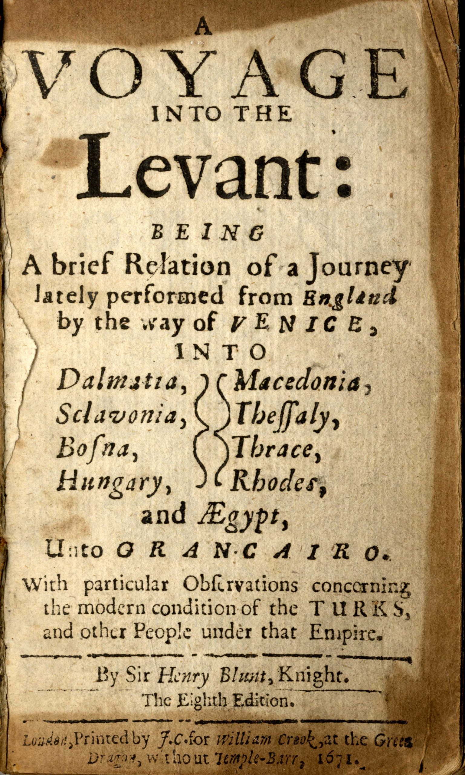 A Voyage into The Levant. A brief relation of a journey lately performed from England by the way of Venice into Dalmatia, Sclavonia, Bosna, Hungary, Macedonia, Thessaly, Thrace, Rhodes, and Ægypt, unto Gran-Cairo. With particular observations concerning the modern condition of the Turks, and other people under the Empire. By Sir Henry Blunt, Knight.