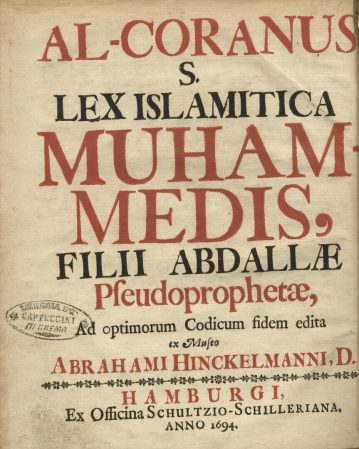 Dr Abraham Hinckelmann (1652-1695), a German Protestant theologian, was an Islamologist who was one of the first to print a complete Qur’an in Hamburg. He studied at Wittenberg and collected many Oriental manuscripts. He compiled a Koranic lexicon in manuscript and planned a Latin translation of the Koran, but this was never realised.