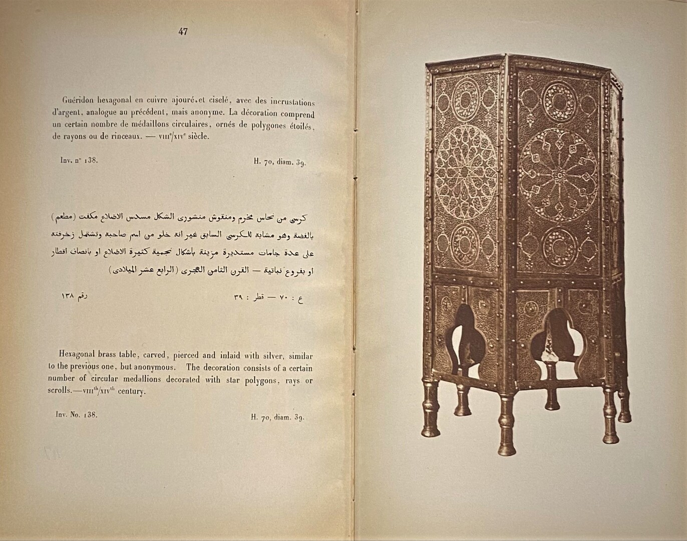 An illustrated album of Islamic works of arts preserved at the Arab Museum of Cairo. The English text is translated by K. A. C. Creswell, while the French is translated by Hassan Hawary. The works of arts that are discussed in this work are made of marble, wood, ceramics, bronze, ivory, copper, textile, silk, wool, and glass.