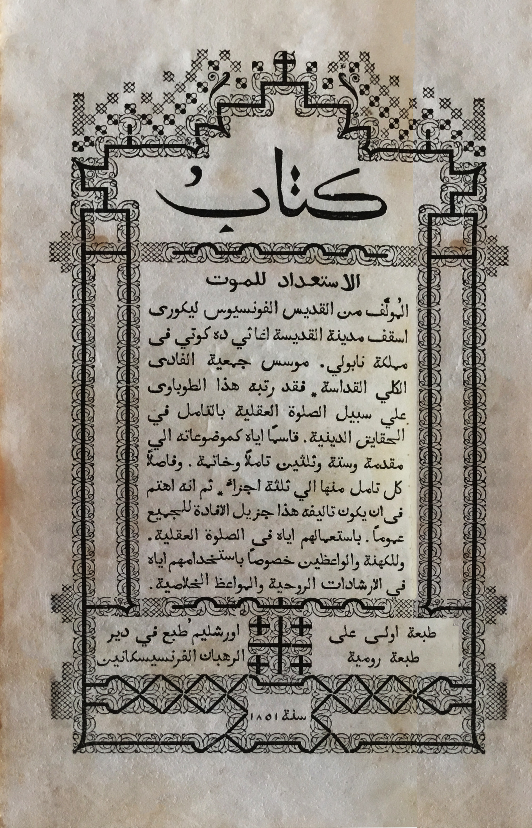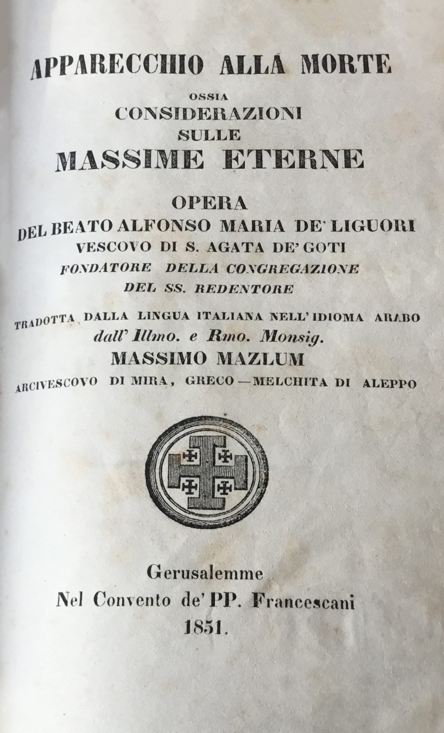 Second Arabic edition, the first Arabic edition was printed in Rome in 1829. This work by Saint Alphonse de Liguori (1696-1787), was written in Italian and published in 1758. It was translated into Arabic by the Archbishop of the Melkite Greek Catholic Archeparchy of Aleppo Maksimus ibn Jirjis Mazlum. Alfonso Liguori (1696-1781) was an Italian Catholic bishop, spiritual writer, scholastic philosopher and theologian. He founded the Congregation of the Most Holy Redeemer (the Redemptorists). As a prolific writer, he published nine editions of his Moral Theology in his lifetime, in addition to other devotional and ascetic works and letters. This work Apparecchio Alla Morte is an ascetic and classical work of Christian spirituality written in 1768. The book can be considered a development of the Massime Eterne previously written by the same author. It was widely popular