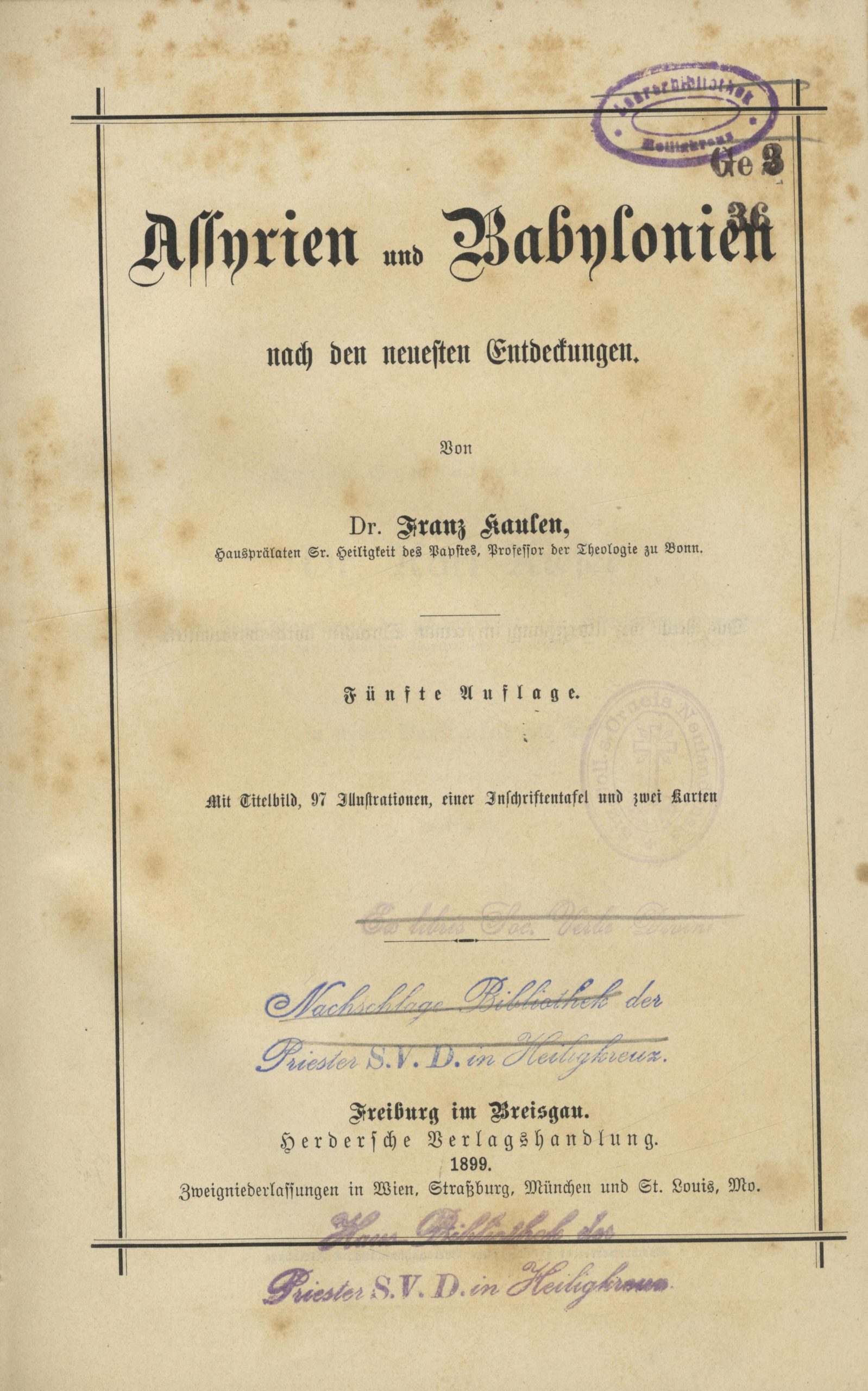 8vo. xiii, [1], 318 pp., [2], German text, half-title, 2 frontispiece plates, 97 illustrations, 2 maps, contemporary half-calf with marbled boards, rubbed, title gilt on raised spine, foxing throughout, library stamps on title page, Freiburg im Breisgau, Herder 1899.
