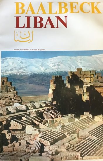 Throughout the years the National Council for Tourism which was established in Lebanon during the 1960s issued a series of posters promoting antiquity sites in the country. The Lebanese economy during that period relied on the revenues from tourism. This is one of the posters depicting Jupiter Temple, Baalbeck.