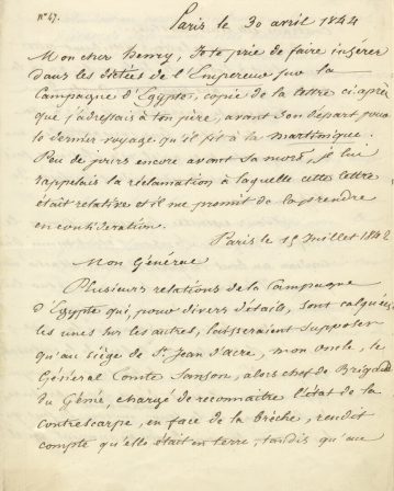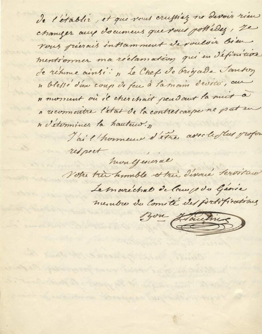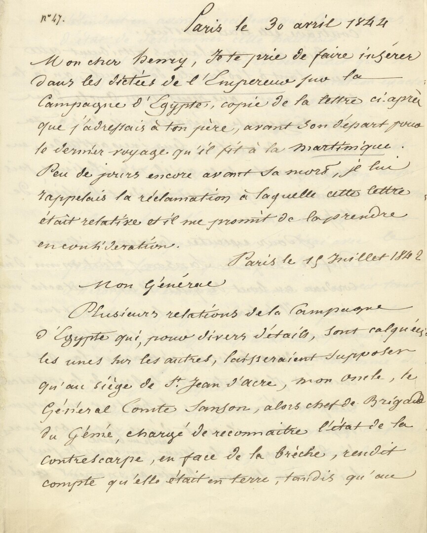 Jules-Antoine Paulin (1782-1870), nephew of General Sanson, ADC to General Bertrand, Colonel of the Corps of Engineers in 1814, given a Barony by Charles X, Field Marshal under Louis-Philippe and Commander of the Defences of Paris. Autograph signed letter to Henry Bertrand (the son). Paris, 30 April 1844. Correspondence as “Field Marshall of the Engineers, Member of the Defence Committee” on the subject of a correction to be inserted into the Accounts of the Emperor on the capture of St John of Acre; beautiful text recounting the event according to the memories as told to him by his uncle, General Sanson (1824). Paulin gives to his son General Bertrand the copy of one of his letters addressed to his father in 1824 before his departure for Martinique to correct some mistakes; (…) Several accounts of the Egyptian campaign which in various details are traced in such a way as would leave one to believe that at the siege of St John of Acre, my uncle, the Count General Sanson, then head of the Brigade of Engineers charged with reconnoitring the state of the counter-scarp, opposite the breach, realised it was made of earth (…). This error was attributed as much to the blackness of the night as to the serious wound sustained by his uncle; I owe it to his memory to put right their mistake (…) In order to carry out his reconnaissance, Brigadier Sanson had furnished himself with a string (…) He dragged himself on hands and knees to the point where he should have engineered his descent into the ditch; it was having arrived there that, lying flat on his tummy on the edge of the counter-scarp, trying to measure its height (…) that he received from one of the embrasures of the 2nd floor of the tower opposite, a shot which passed through his right hand (…) an accident which made it impossible for him to determine this height. From this exposure, he evidently came out since if this officer could not give an exact indication about this last point, at least, he could scarcely doubt that the counter-scarp was lined and give erroneous intelligence (…). For if one were to suppose that such a perilous operation as the descent into the ditch would not have been a surprise attack (…) I would say with General Sanson that it was rather an act of daring heroism, such had been seen often in the campaigns of this era, an act like those in previous times had been manifest at the siege of Jaffa (…).