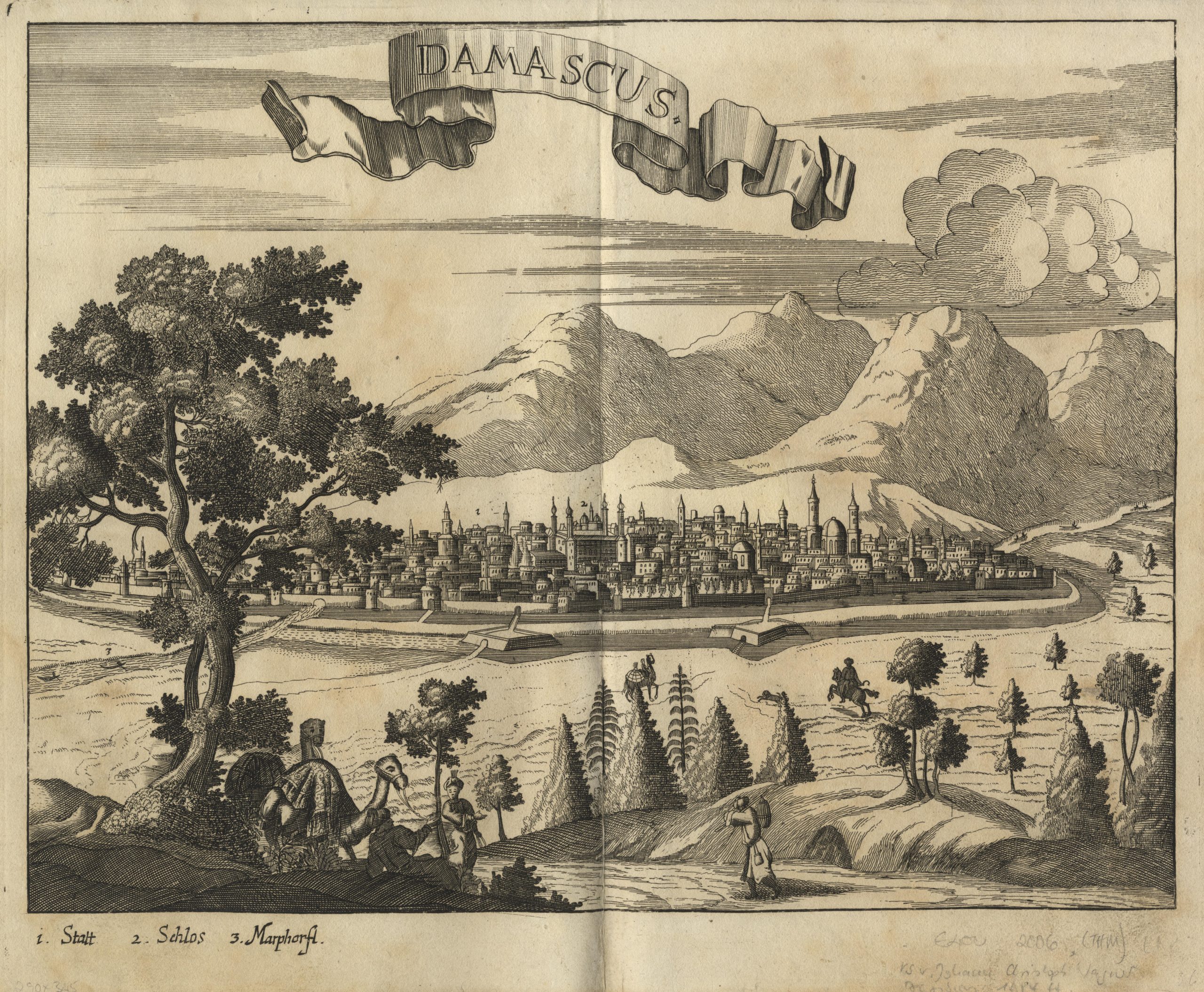 290 x 345 mm (11½ by 13½ inches); Copper engraved, view of Damascus from Johann Christoph Wagner’s " Delineatio provinciarum Pannoniae et imperii Turcici in oriente. Eine grundrichtige Beschreibung deß ganzen Aufgangs sonderlich aber deß hochlöblichen Königreichs Ungarn und der ganzen Türckey." by Jacob Koppmayer. Dark Impression; lower centre fold split repaired where guard removed; very light foxing to sky; 1684-1685