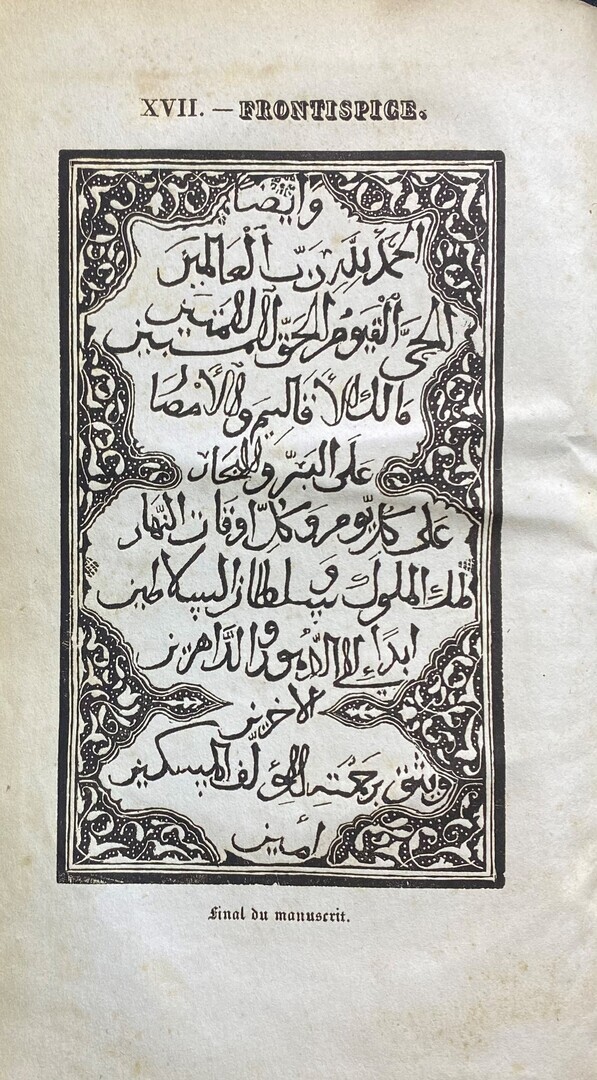 8vo. Volume I: 484 pp., 7 wood engravings / Volume II: 496 pp., 8 of 9 wood engravings, Lacking Plate IX: portrait of the author / Volume III: 504 pp., 9 wood engravings, including a frontispiece of Arabic text to each volume, numerous illustrations in text of Islamic calligraphy and design, original cloth backed boards, lightly rubbed round edges, title gilt on spine, edges of first three pages of volume II slightly chipped without loss, weak spine, scattered foxing, otherwise set in overall good condition, Imprimerie Felix Locquin & Henri Dupuy, Paris, 1833-1835.