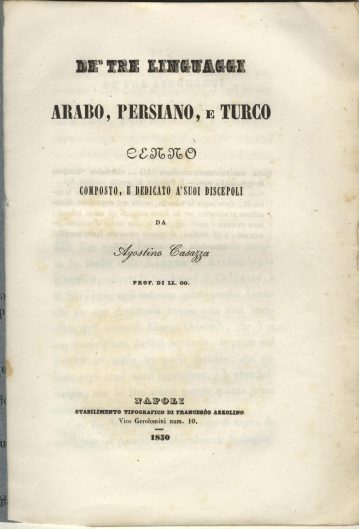 Extremely rare work. The author, a teacher in Oriental languages at the University of Naples and member of the Pontinian Academy, compares the Arabic, Persian and Turkish idioms, highlighting their origin and the main differences. [Schipa Michelangelo, “Commemoration of Augustine Casazza”, in Atti dell’Accademia Pontiniana, Vol. XXI, 1891, p. 243]. Not in COPAC.