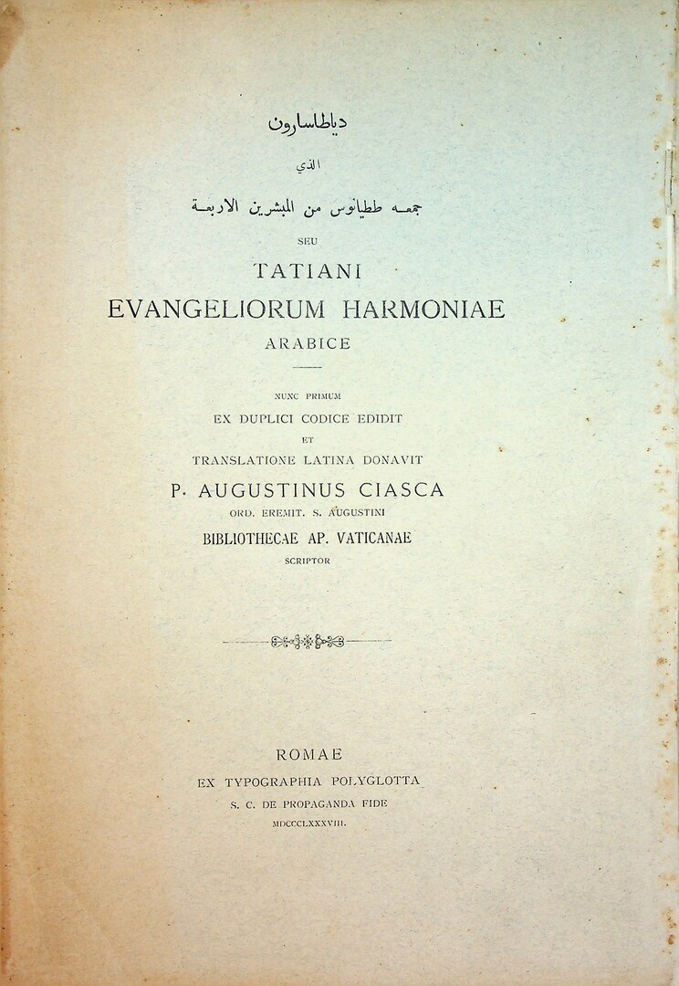Diyatasarun alladhi jama’ahu Tiyanus min al-Mubashshirin al-Arba’ah. Seu, Tatiani evangeliorum harmoniae arabice. Nunc primum ex duplici codice edidit et translatione latina donavit P. Augustinus Ciasca.