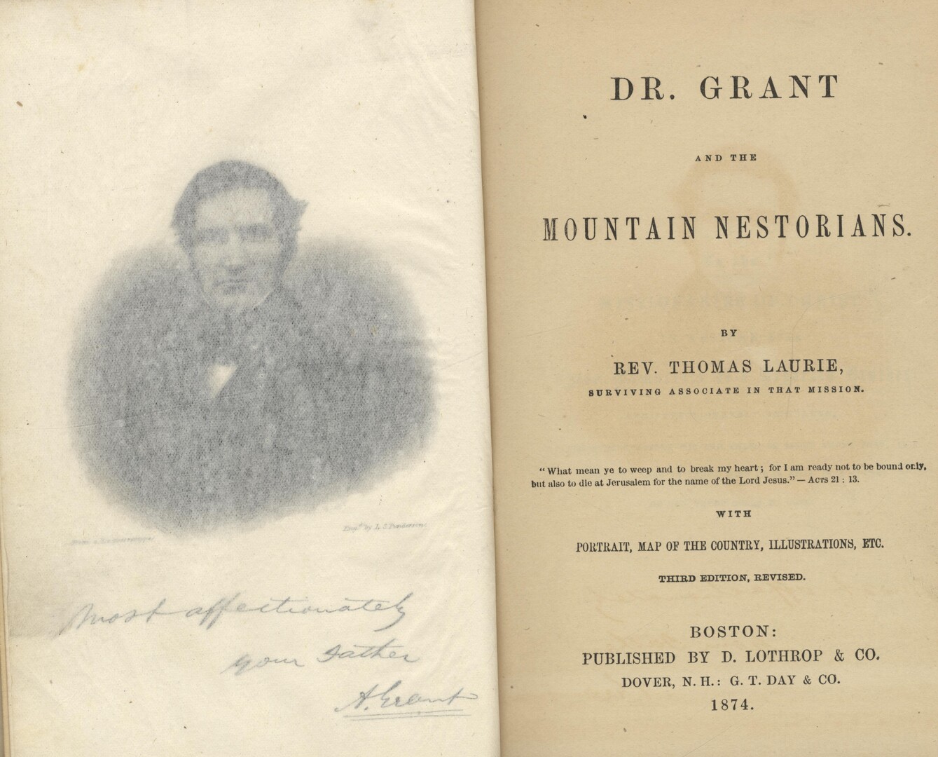 This is an account of Dr. Grant’s work among the Nestorians. Thomas Laurie himself spent 2 or 3 years in Persia and left Mosul in 1844 after Grant’s death when the Mission was suspended. His work also contains interesting accounts of political activity among the Kurds, the Turks, and the Nestorians. He later wrote Mount Lebanon in 1869 and Bible Illustrations in 1870.