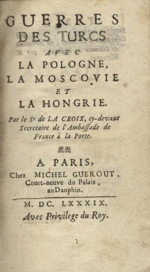 First original edition, dedicated to the King of France. Édouard de La Croix (often referred to as the Sieur de La Croix) was a French diplomat and orientalist, probably born around 1640, died in Paris in 1704. He stayed in the Ottoman Empire as embassy secretary between 1670 and 1686.