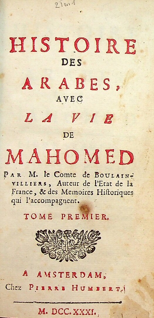 RARE. Count Boulainvilliers (1658-1722) was an ardent admirer of Prophet Mohammed and placed Islam far above traditional Christianity. Accordingly, it is not surprising that his work demonstrates strong anticlerical tendencies. He extols the Prophet as a wise man, as an instrument of God and perceives in him the person who propagates a sensible religion, having replaced an erroneous religious service by the true one. The first volume contains a description of Arabia, the customs and traditions of the Arabs together with a description of Makkah and Madinah. The third part of the volume “Qui contient la Vie faux Prophete depuis la premiere Egire jusqu’a sa mort” does not originate from Boulainvilliers himself, he had died in 1722. The anonymous author of this last part has not yet been identified.