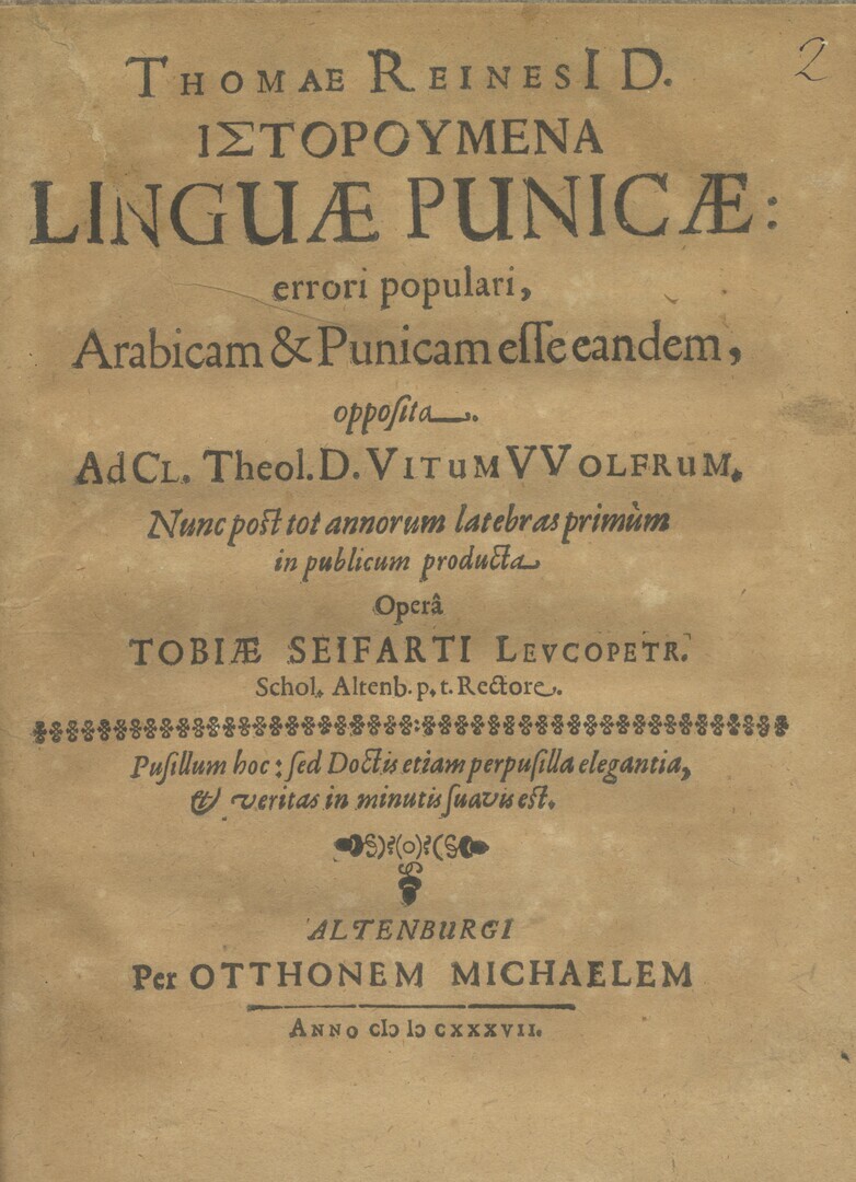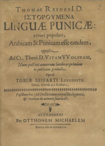 Historoumena linguae Punicae, errori populari Arabicam et Punicam.