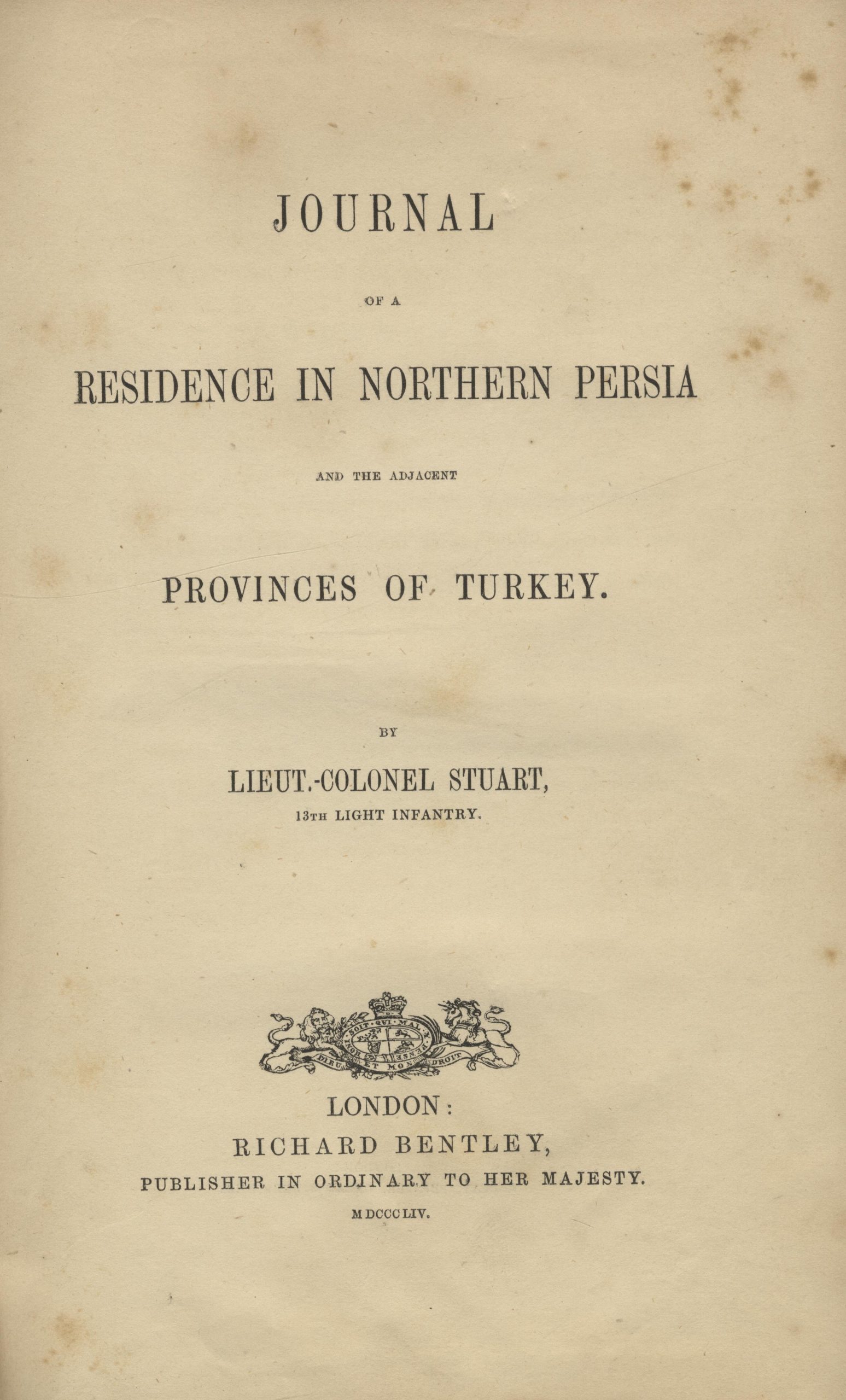 Scarce work. At the recommendation of James Morrier, the author of ‘Hajji Baba’, the writer of these journals decided to publish them. Stuart left England in 1835, sailing to the Ionian islands and proceeded to Constantinople. Three chapters were dedicated to the Ottoman society and the relations between the Turks and the Armenians. The majority of the work is a detailed analysis of the Persian and Ottoman politics of the period.