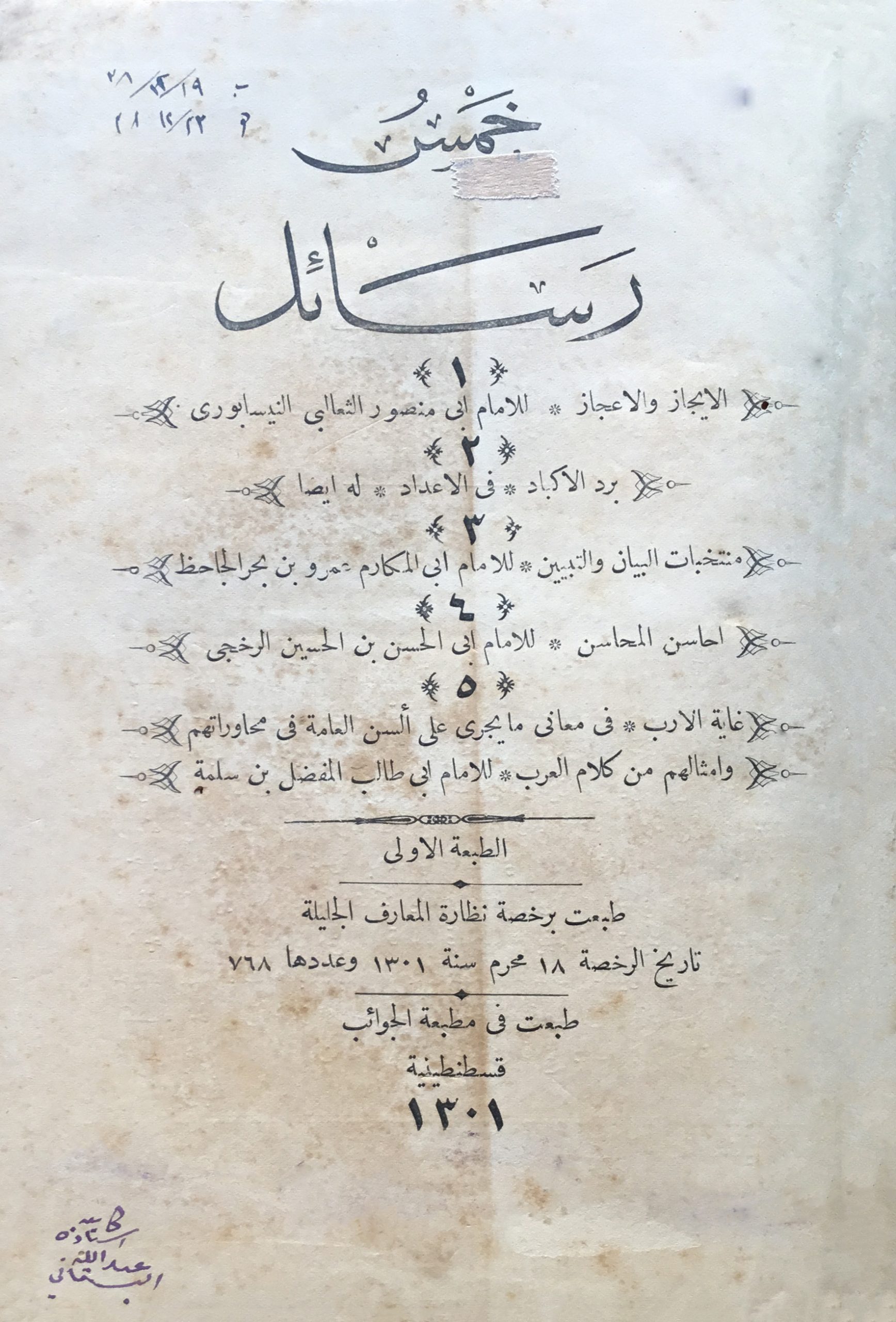 This is another publication of al-Tha’alibi’s letters sand three other scholars elected by Ahmad Faris al-Shidyaq, the publisher of “al-Jawa’ib”.