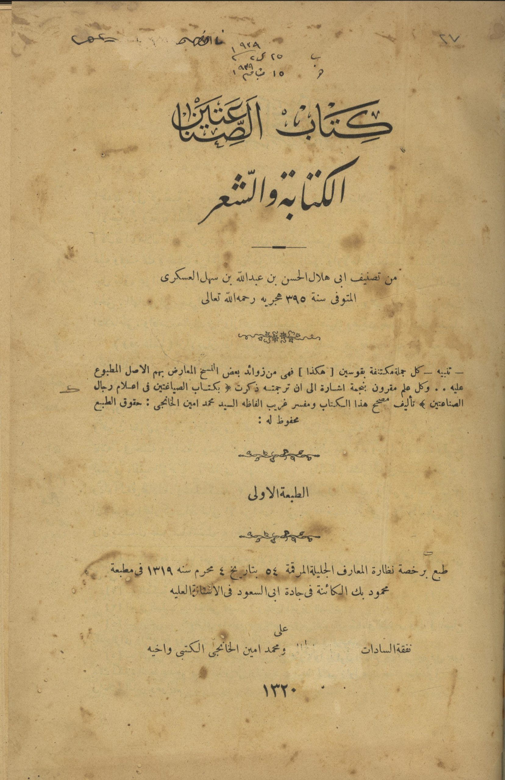 Kitab al-Sina’atayn al-Kitabah wa al-Shi’ir. [The book of two arts: prose and poetry]. كتاب الصناعتين الكتابة والشعر