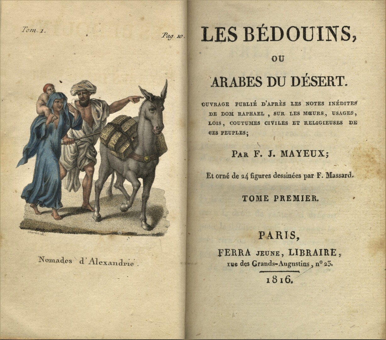 Rare early work on the Bedouins. The editor in his preface mentions that the author’s name of this book is Dom Raphael of Egyptian origin who brought to France material related to Bedouin life, gathered by him from Egypt and Syria where he lived for a long time. In fact, Raphael de Monachis [Dom Raphael, Raphaël Antun Zakhûr de Monachis], born in Cairo from a Syrian family, was the priest to the Greek community in Cairo, He was an Arab member of the French Institute of Egypt and the first interpreter of the Diwan from Cairo. This work edited by F. J. Mayeux, provides a comprehensive view of the local tribes in Egypt and Syria at the time of the French Expedition and was probably composed during the French occupation.