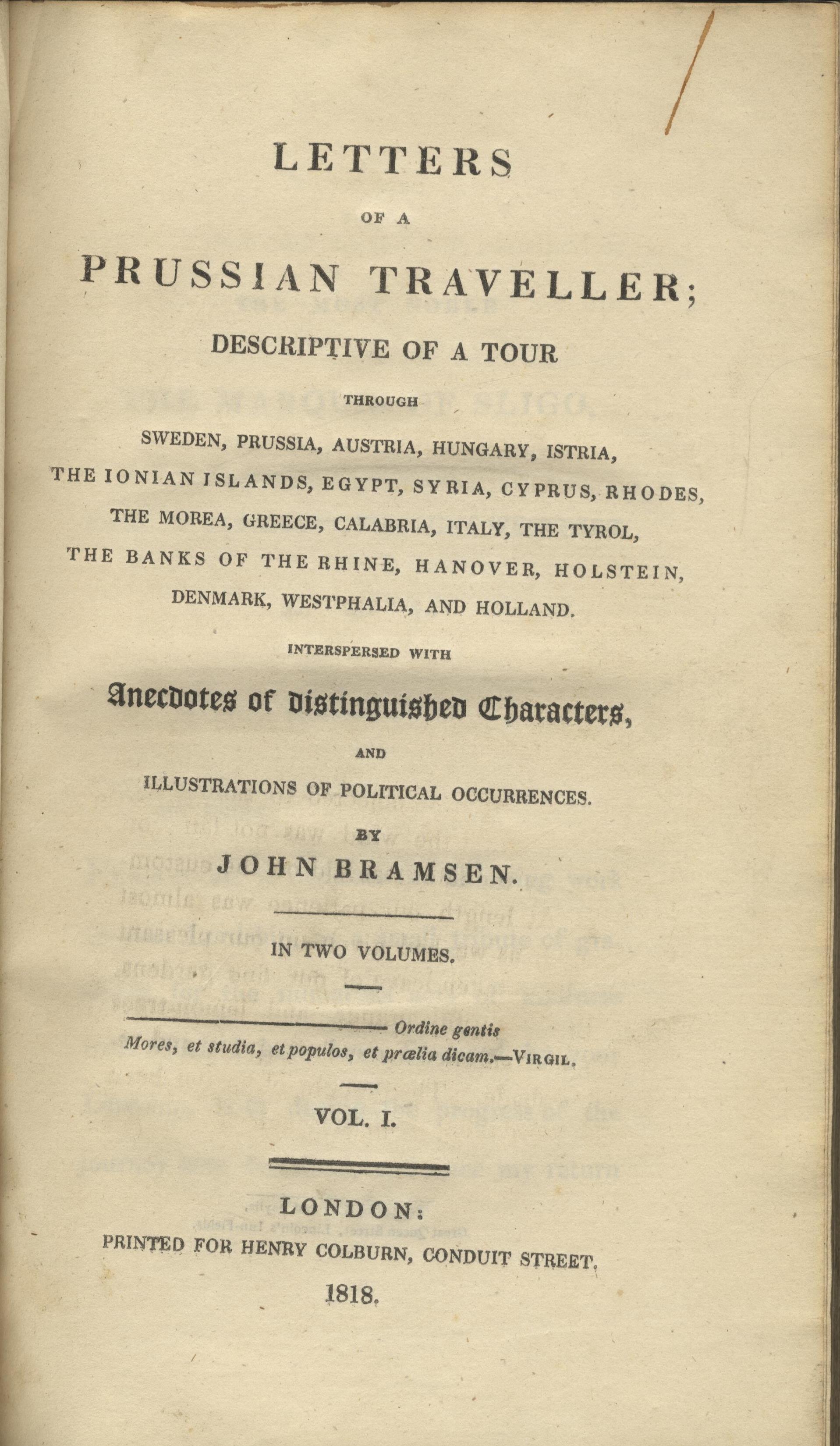 Bramsen, who was of German origin, settled in England in the early part of the 19th century. He left England in August 1813 and did not return until December 1815; he spent most of this time in the company of Sir John Maxwell. A year was spent in Italy and six months in the Levant, most of it in Greece. The work contains a number of interesting anecdotes.
