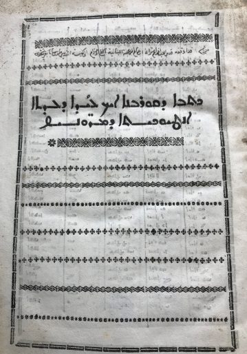Folio. Syriac and Karshuni text printed in red and black within borders, manuscript note in Arabic at head of title-page, contemporary blind-tooled leather, rubbed & soiled, some soiling and wax stains, heavy in places, stamp on second leaf, top corners of few leaves torn away (not affecting text), leaves 2-3 becoming loose, Monastery of St Antony, Kozhaya, Lebanon, 1855.