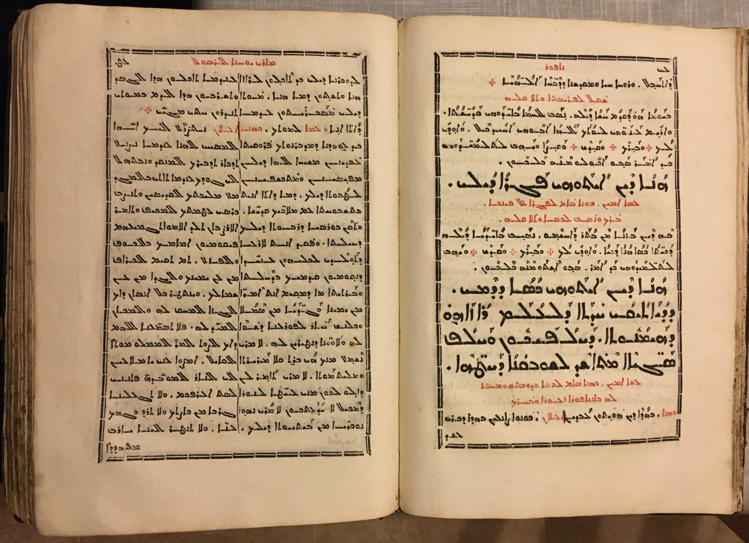 RARE PUBLICATION FROM THE MONASTERY, WHICH STARTED PRINTING IN THE MIDDLE EAST IN 1584. Third edition of this liturgical text, the Maronite missal, with the text in Syriac and Garshuni (Arabic written in Syriac characters with diacritics), together with the portions of the Gospels appointed to be read at the same throughout the year; previously issued by the same press in 1816 and 1838. The translator, Jibra’il (Germanus or Gabriel)Farhat (1670-1732), was archbishop of Aleppo and a renowned Arabic scholar.