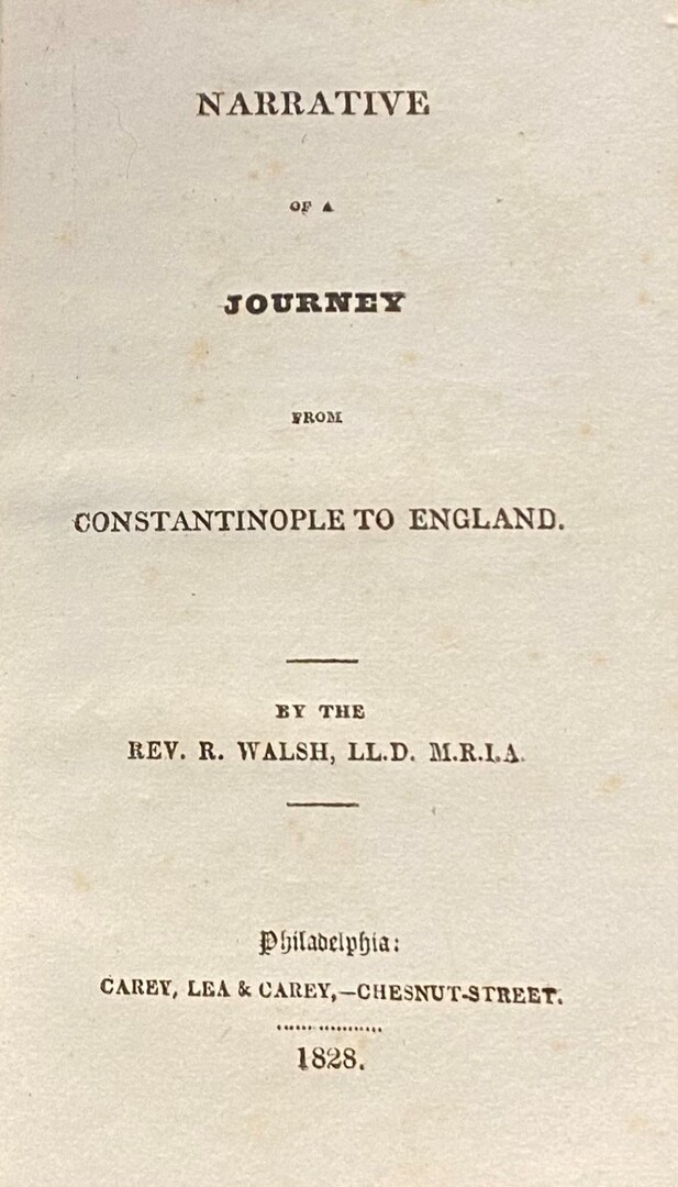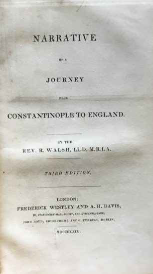 Robert Walsh (1772 –1852) was an Irish clergyman, historian, writer and physician, arrived in Constantinople in 1821 as chaplain to Lord Strangford’s embassy. The journey described in this work took place in 18824/5 and describes his return to England. In 1830 Walsh returned to Constantinople and remained there until 1835.