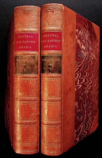 Palgrave (1826-1888) was a former member of the 8th Bombay Infantry,who left the army to become a Roman Catholic missionary. After being ordained by the Jesuits in Madras,he ministered in Southern India and Syria,before embarking on his journey through Arabia. “For many years Arabia had remained closed to Europeans. Palgrave now undertook an adventurous journey across Central Arabia,which he accomplished in 1862 and 1863. His object was to ascertain how far missionary enterprise was possible among pure Arabs,but he also accepted a mission from Napoleon III,who furnished funds for the journey,for the purpose of reporting on the attitude of the Arabs towards France,and on the possibility of obtaining pure Arabian blood-stock for breeding purposes in Europe. Passing as a Syrian Christian doctor and merchant,he found his best protection in his intimate acquaintance with Arabian manners. But he carried his life in his hands; for in the midst of the Wahabi fanatics of Central Arabia,detection would certainly have been his ruin. The result of his journey he embodied in one of the most fascinating of modern books of travel,his `Narrative of a Year’s Journey.,’ published in 1865” — DNB.