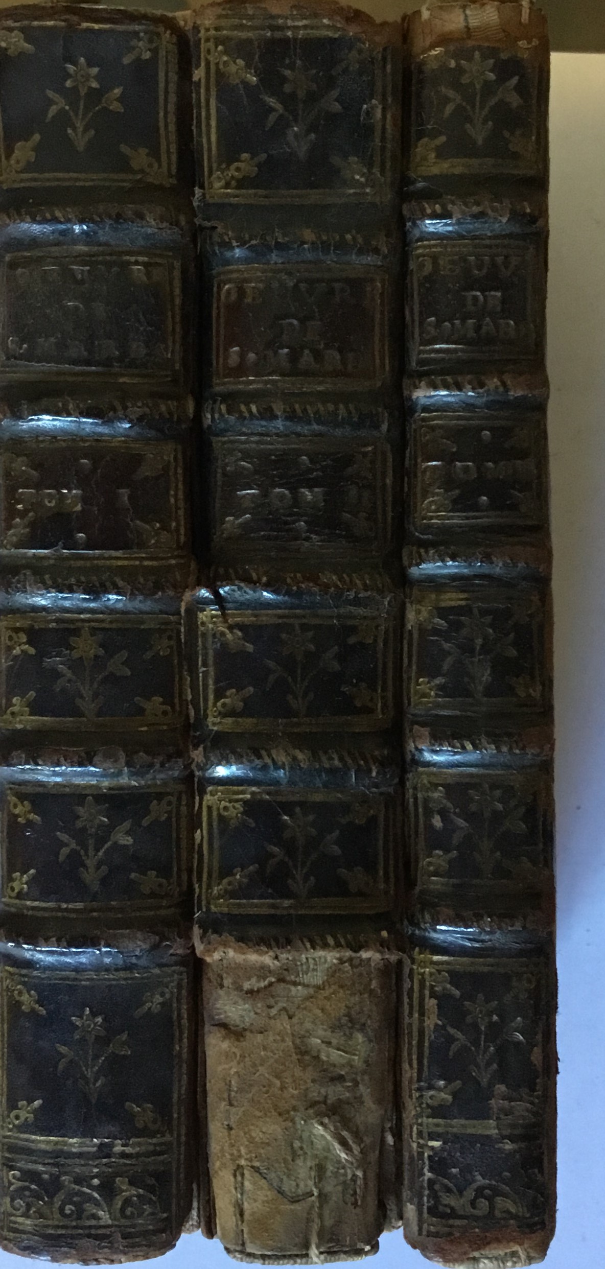 12mo. Volume I: Dialogues des Dieux; viii, 383 pp., steel engraved frontispiece, engraved vignette on title page / Volume II: Lettres Galante et Philosophiques; ii, 399 pp., steel engraved frontispiece, engraved vignette on title page / Volume III: Lettres Philosophiques; [2], 260 pp., steel engraved frontispiece, engraved vignette on title page, contemporary full calf, rubbed, hinges weak, lower part of volume III spine missing, marbled endpapers & outer edges, book plate verso front cover of volume one, Pierre Mortier, Amsterdam, 1744.