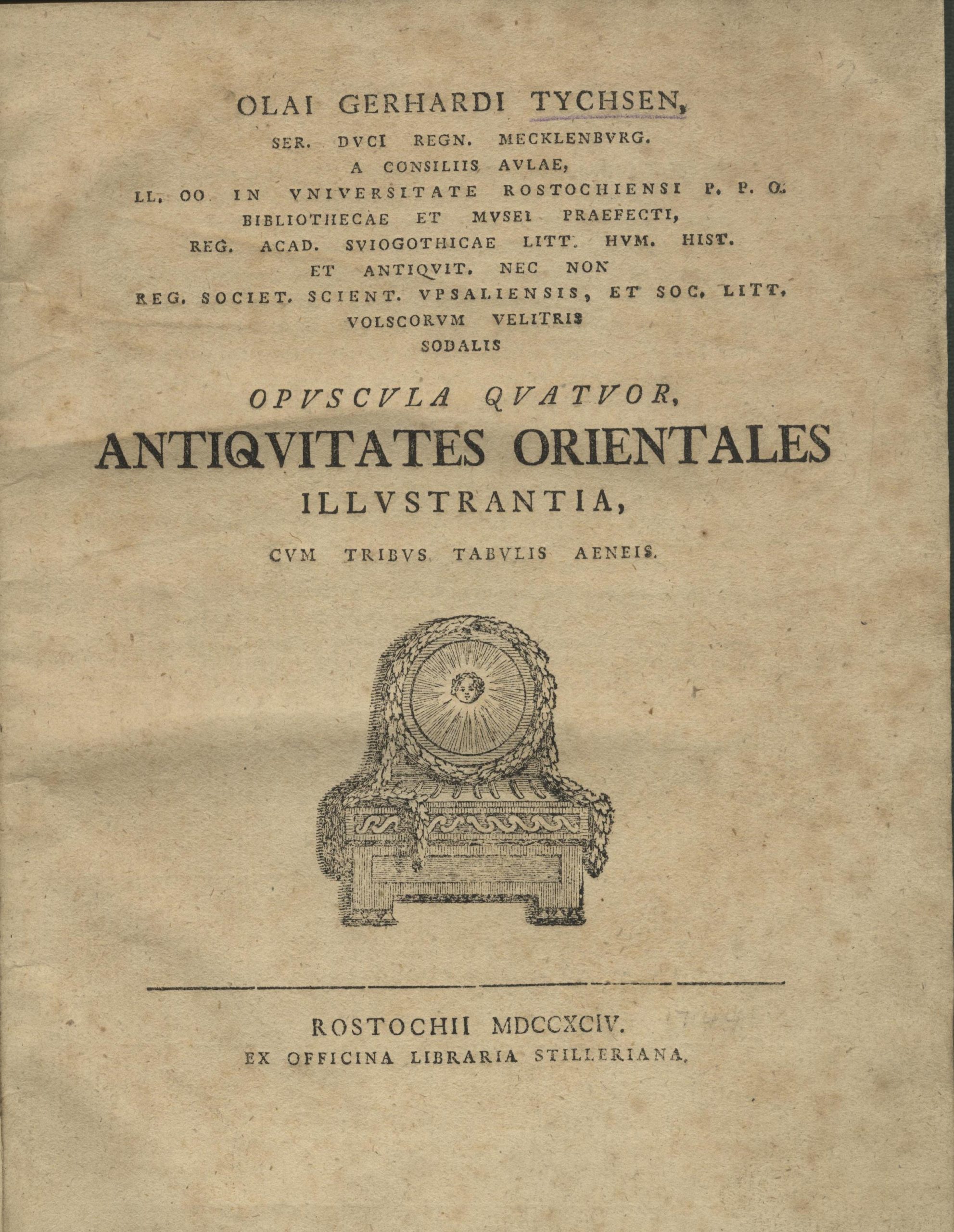 Opuscula quatuor antiquitates orientales illustrantia + Interpretatio inscriptionis cvficae in Marmorea Templi Patriarchalis S. Petri cathedra, qva S. Apostolvs Petrvs Antiochiae sedisse traditvr + Appendix ad inscriptionis cuficae Venetiis in Marmorea Templi patriarchalis S. Petri Cathedra conspicuae interpretationem + Explicatio Cuficae inscriptionis quae in columna lapidea musei Societatis antiquariorum Londinensis conspicitur. FOUR VOLUMES IN ONE.