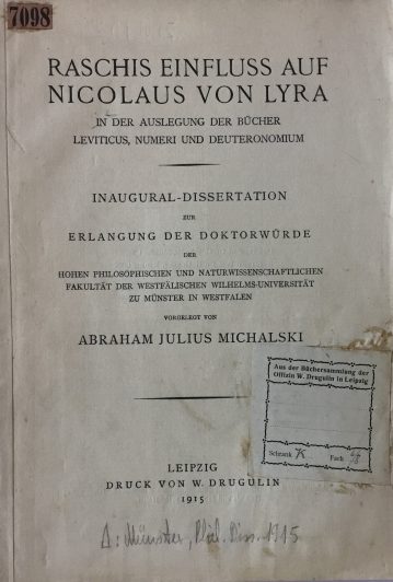 Inaugural dissertation to obtain a doctorate from the high philosophical and natural science faculty of the Westphalian whilhelms university in munster in westphalia. [Raschi’s influence on Nicolaus of Lyra, in the interpretation of the books Leviticus, Numbers and Deuteronomy].