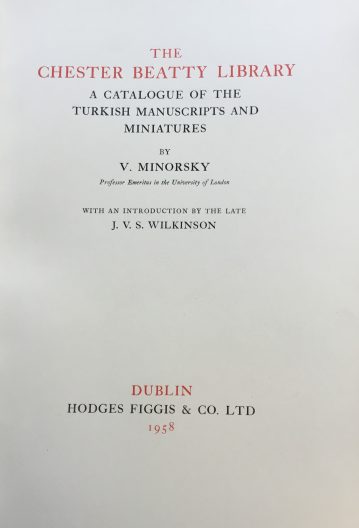 An important work that contains a detailed breakdown of Turkish manuscripts in the Chester Beatty Library. “ Turkish fine books and miniatures, though closely related to those of Persia, contain interesting features of their own. They are, however, not very well known, largely because of the European public collections are rather weak in good examples. I have been fortunate in acquiring a varied collection which includes some outstanding works, and I hope this catalogue will be a help to scholars and art-lovers alike” Foreword.