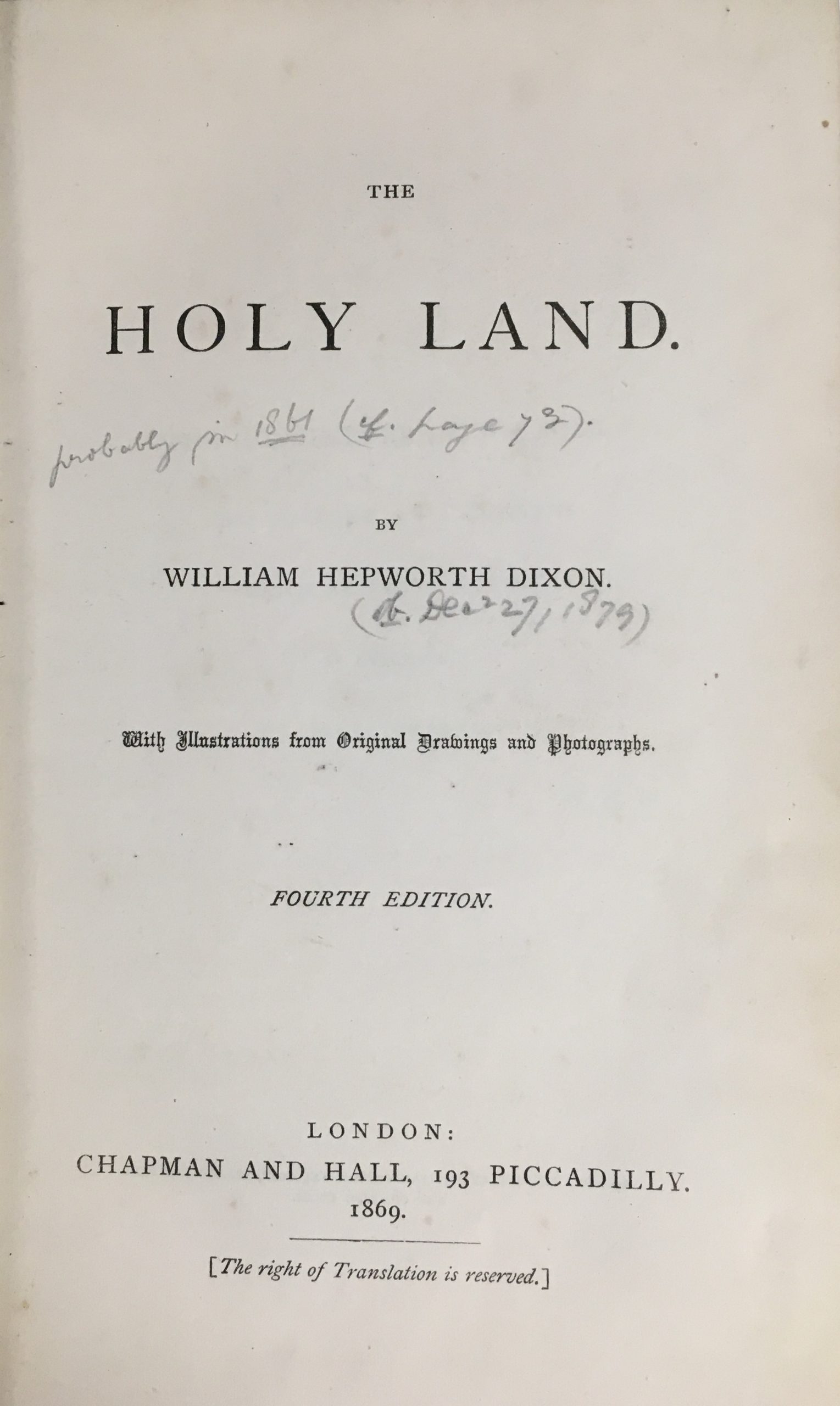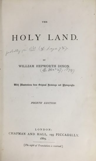 8vo. xi, 418 pp., [ 1 advert], with illustrations from original paintings & photographs, original blue cloth, faded & rubbed, title gilt on spine, pencil annotations on few pages, book plate of Paola & Bertrand Lazard verso front cover, Chapman & Hall, London, fourth edition, 1869.
