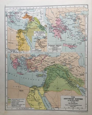 4to. comprising 93 pp., of text, an historical atlas of 96 pages in colour, a comparative time chart of universal history in seven sections (on canvas), 64 b/w plates, contemporary embossed full calf, spine worn and split, occasional foxing, remainder of label removed from endpaper, library blind stamp on title page, otherwise in overall good condition, The Encyclopaedia Britannica Co. Ltd, London, 1935.