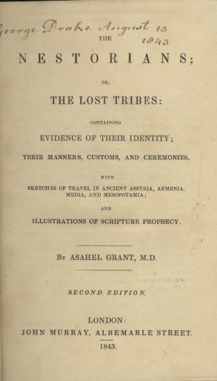 This is one of the most interesting of the many accounts produced by missionaries in the Levant. After Smith’s and Dwight’s account of their travels in Persia in 1831 it was decided to undertake a mission to the Nestorians which would include a physician. Grant and his wife arrived in Turkey in 1835 and travelled overland 700 miles to Tabriz on the border between Persia and Turkey, east of Lake Urmiah. The mission itself was established in Urmiah, west of the lake and at the foot of the mountainous region which separates Lake Van from Lake Urmiah. In 1839 Grant made a dangerous journey into this region in order to find the independent Nestorians, whom he believed to be one of the lost tribes of Israel. In 1840 he returned to the States and arranged for his book to be published, but he soon went back to Persia to establish a mission at Ashitha (Asheta), in the middle of Kurdistan, for the mountain Nestorians. The attention thus drawn to these people may have created tensions between them and the Kurds; they were massacred by the Kurds in 1843. Grant managed to escape to Mosul, where he died in 1844 of a fever while ministering to refugees.
