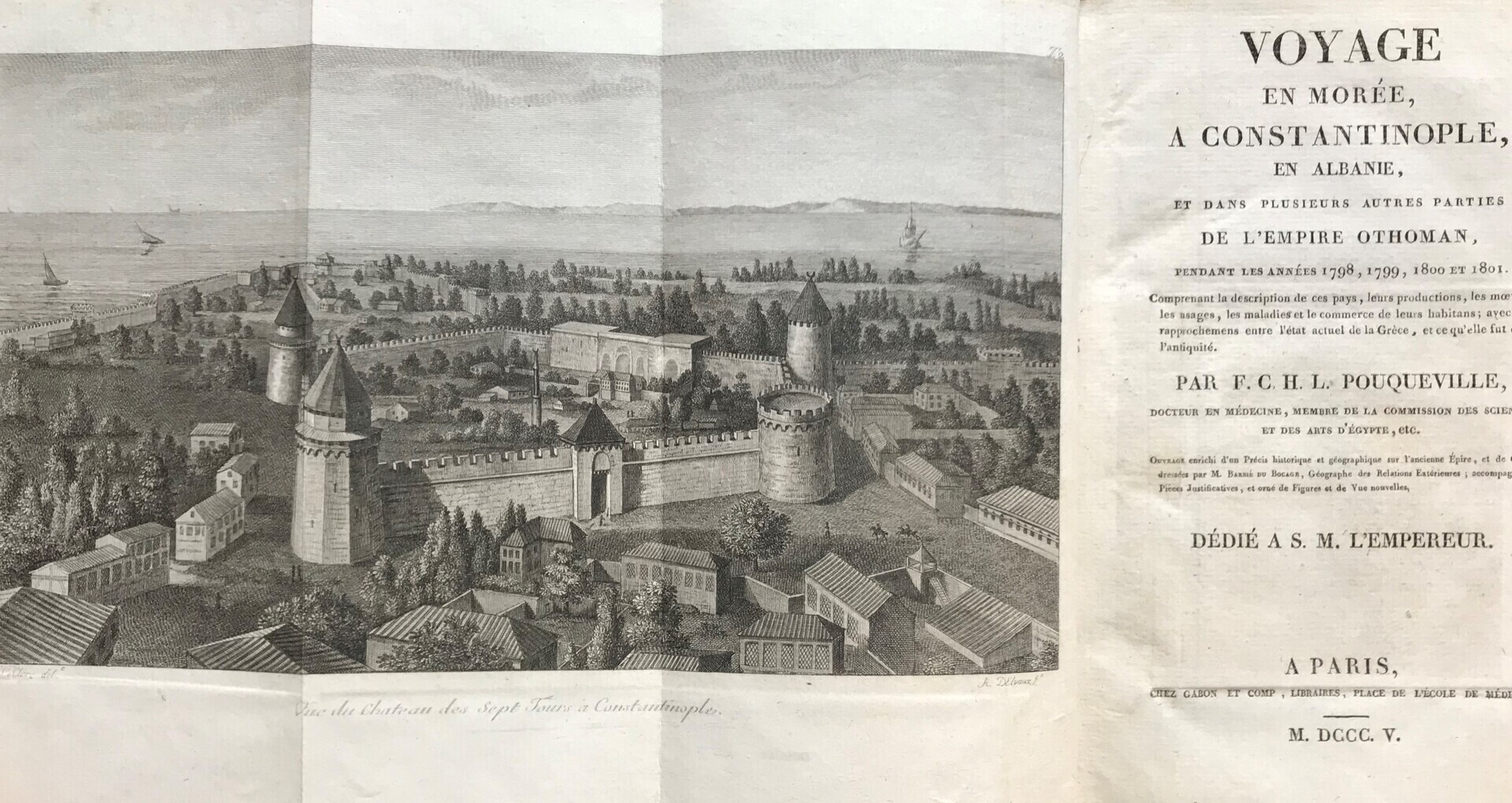 This work is the first and probably the best of Pouqueville’s books on Greece. Pouqueville had joined the French expedition to Egypt as a medical man attached to the scientific commission. On his return to Italy in 1798 he was captured by privateers who landed him at Navarino. He was imprisoned at Tripoli for ten months and later was taken to Constantinople and confined to the prison of Seven Towers for two years. Although officially a prisoner of war he was able to move about during his stay in Tripoli; he studied modern Greeks, was able to make notes of his observations. He returned to France in 1801, produced his medical thesis on the plague, and wrote up this account of his experiences in the Levant. The book attracted a good deal of attention: Possibly the dedication to Napoleon helped. In 1805, as a result. Pouqueville was appointed French agent at Ionnina. The work contains a great deal of information on popular customs, superstitions, songs, etc. “Whether original or not, Pouqueville gives us the best picture of the Romaioi, as he calls them”. (….Malakis, pp. 53-3 ).