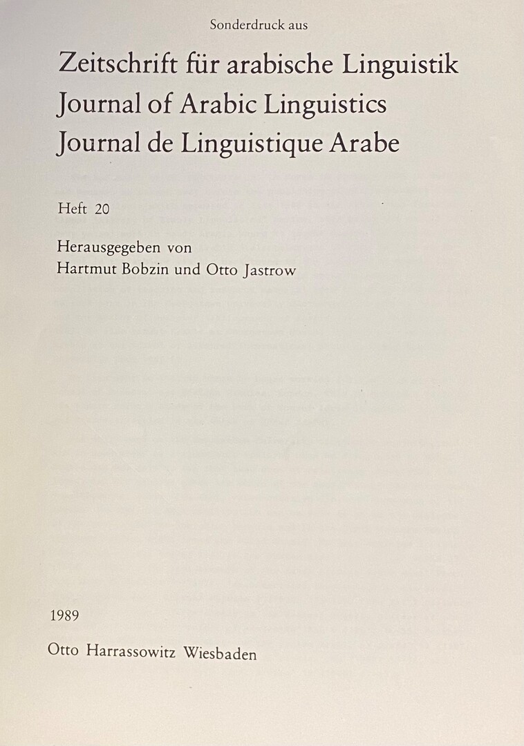 8vo. 2 pp., English text, publisher’s stapled wrappers, off print from the Journal of Arabic Linguistics, Otto Harrassowitz, Wiesbaden, 1989.