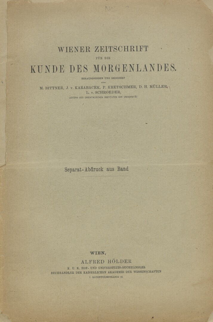 8vo. 18 pp., German & Arabic text, publisher’s original wrappers, unopened, Extrait du Journal Asiatique, Juillet-September, 1932 & Wiener Zeitschrift fur der Kunde des Morgenlandes, Imprimerie Nationale, Librairie Orientaliste Paul Geuthner, Paris, 1932.